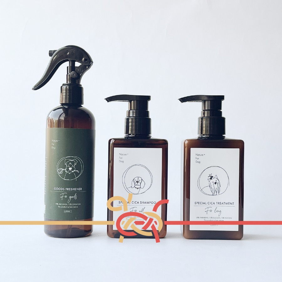 グッズやわんちゃんのトイレ後の消臭・除菌にご使用いただける除菌スプレーにライン使いできるシャンプーとトリートメント、そしてお散歩の時やご旅行などにも重宝いただけるオリジナル巾着と盛り沢山のお得なセットです。